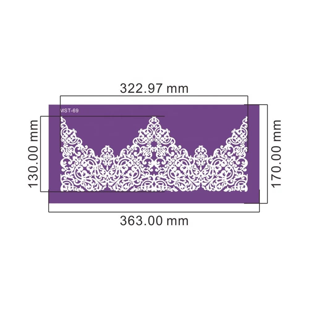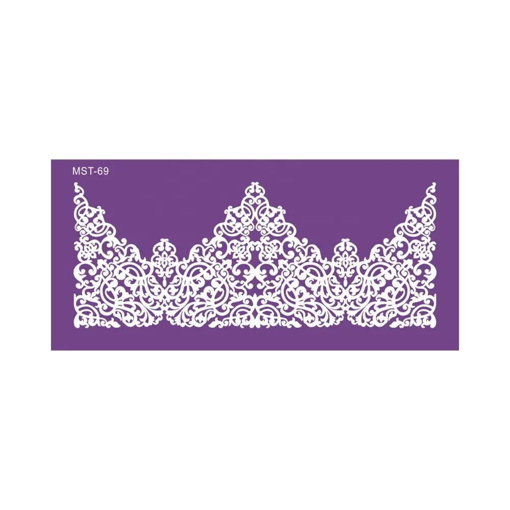 This crown styled Mesh cake stencil is made from a very fine food safe mesh material. Highly detailed filigree designs can be obtained because of the fine mesh material when compared to regular plastic cake stencils. This Mesh stencil is quite flexible and therefore easily wraps tightly against the outer edge of a round cake creating a fine finish.
